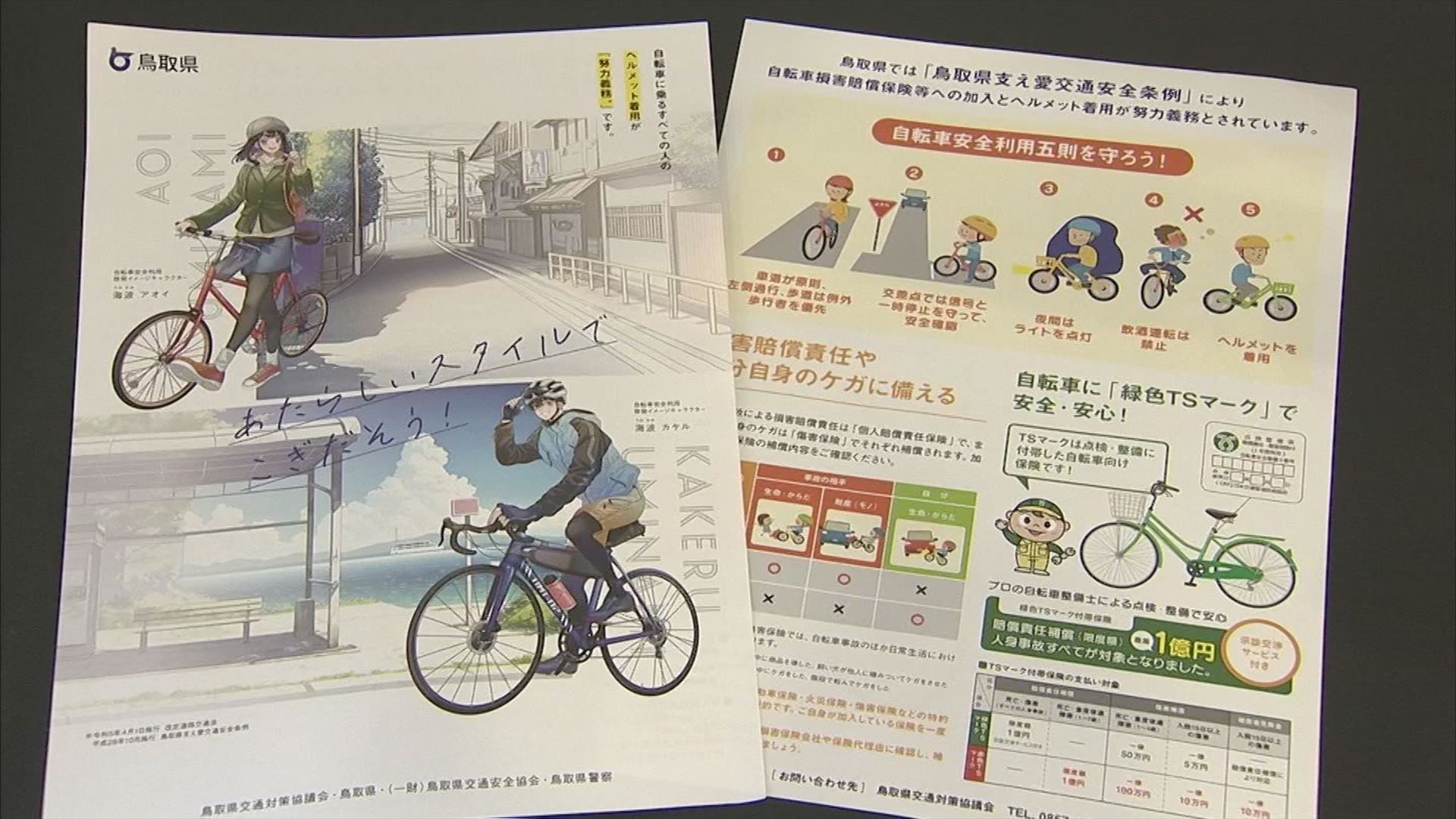 チラシには、ヘルメット着用の努力義務化のほか、安全利用や自転車損害保険の加入を呼びかける内容が記載されています。