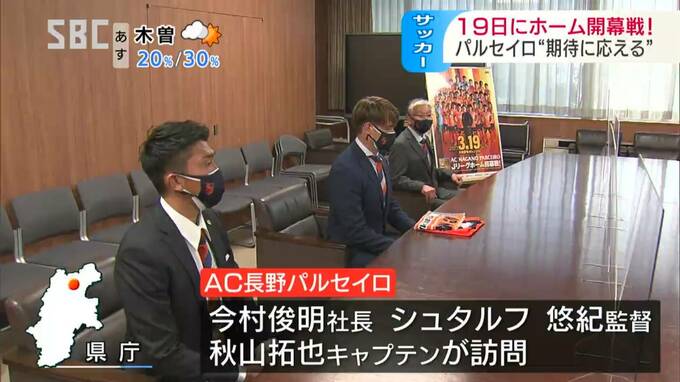 長野県庁を訪れたのはサッカーJ3・AC長野パルセイロの今村俊明(いまむら・としあき)社長とシュタルフ悠紀(ゆうき)監督、それに秋山拓也(あきやま・たくや)キャプテンで、阿部知事に19日・日曜日に実施されるホーム開幕戦に向けて意気込みを語りました。