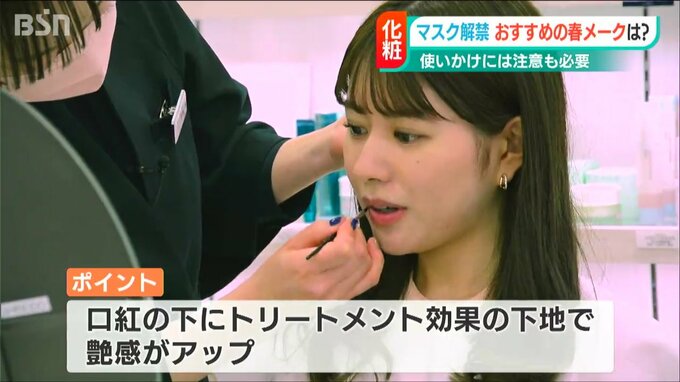 マットな口紅の下にトリートメント効果のある下地をつけることで、春らしい艶のある唇になるそうです。
