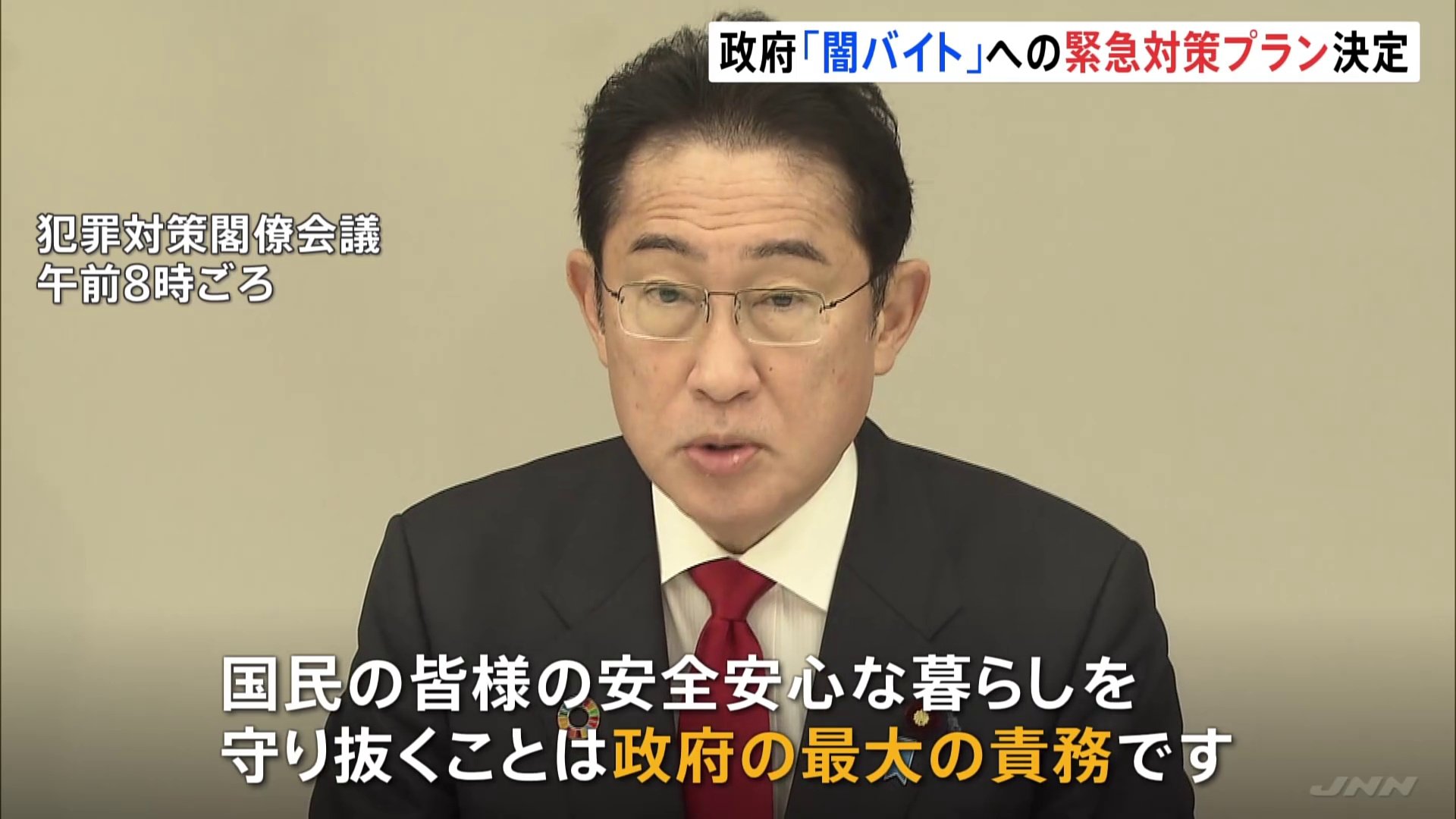 政府は相次ぐ強盗や特殊詐欺事件を受け、SNS上で強盗などの実行犯を募るいわゆる「闇バイト」などに関する緊急対策プランを決定しました。岸田総理「最近、SNSを使って実行犯を募集する闇バイト強盗と言われる強盗…