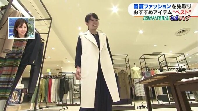 スーペリアクローゼットうすい百貨店店・佐々木咲安香店長「今年のトレンドはこちらの「ジレ」になります。もともと持っていたお洋服をがらりと、着ただけで変化させることができるので着回しアイテムとして人気が出ています。」