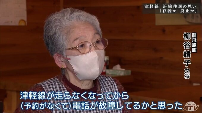 ※龍飛旅館 柳谷靖子 女将「津軽線が走らなくなってから。(予約がなくて)電話が故障してるんじゃないかと思った。(被災前は)冬場でも来てくれたのに、今年は何名だろう来てくれたの。観光にとっても大事な津軽線、地域の住民にとっても大事な津軽線」