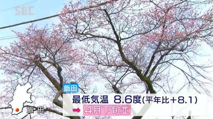 飯田のけさの最低気温は8.6度で、平年より8.1度高く、4月下旬並の暖かさとなりました。