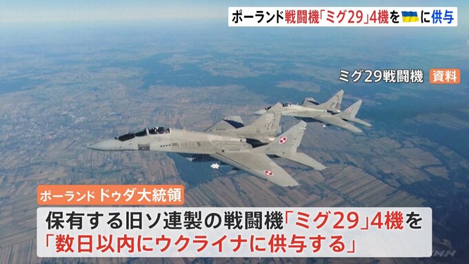 侵攻を続けるロシアに対抗するためウクライナが強く供与を求めてきた戦闘機について、ポーランドがNATO=北大西洋条約機構加盟国として初めて、保有する4機を数日中に供与すると表明しました。ポーランドのドゥダ…