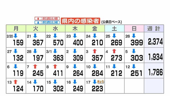 223人の保健所別の内訳は、長野市が51人、松本市が45人、県が管轄する上田が35人、飯田が18人、諏訪、伊那、北信がそれぞれ12人などとなっています。感染者の数は前週の金曜日と比べて61人少なく、4日連続で前の週の同じ曜日を下回っています。