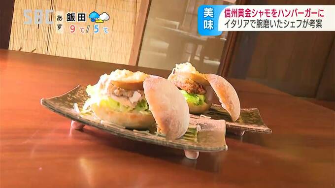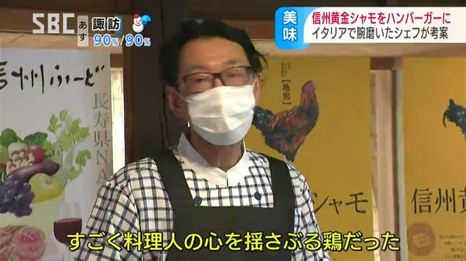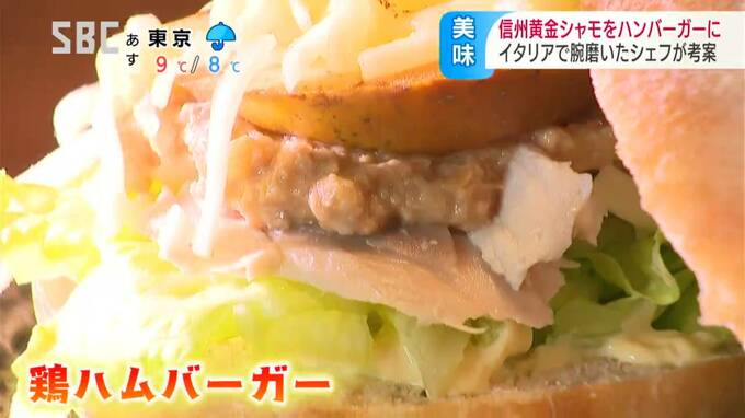 長野県のオリジナル品種=信州黄金(おうごん)シャモを主役に、イタリアで腕を磨いたシェフが考案したメニューは『ハンバーガー』です。
