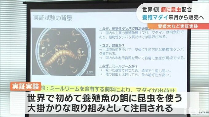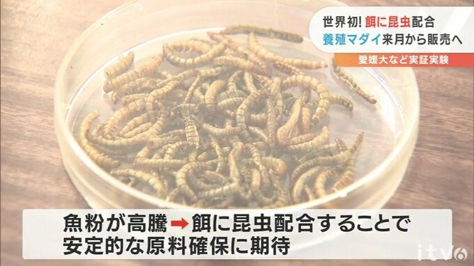愛媛大学などが去年から始め、養殖魚のエサに昆虫を使う世界初の取り組みとして注目された実証実験。昆虫が配合されたエサを食べて育った養殖マダイが、来月から販売されることになりました。