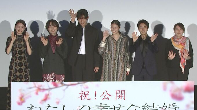 映画『わたしの幸せな結婚』が17日、公開初日を迎え、主演でSnow Manの目黒蓮さん、共演の今田美桜さん、なにわ男子の大西流星さん、前田旺志郎さん、髙石あかりさんらが舞台挨拶に登壇しました。