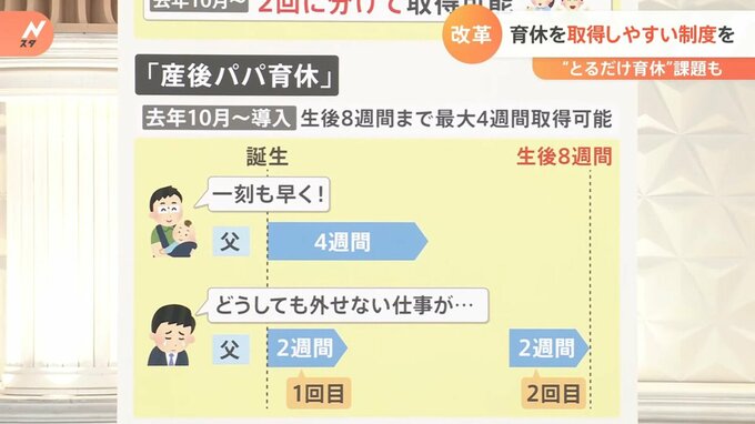 岸田総理が17日、会見で男性の育児休暇について新たな方針を明らかにしました。それは、「産後パパ育休」利用者の給付金引き上げなどの制度強化です。その一方で、男性の育休取得率は14%に留まっています。今後の…