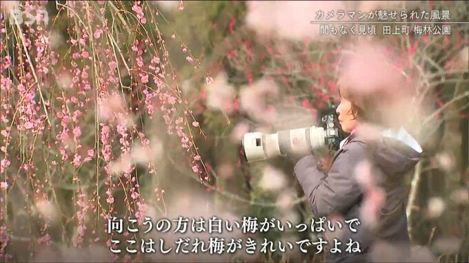 「趣味で写真を撮っています。向こうの方は白い梅がいっぱいで、ここはしだれ梅がきれいですよね」
