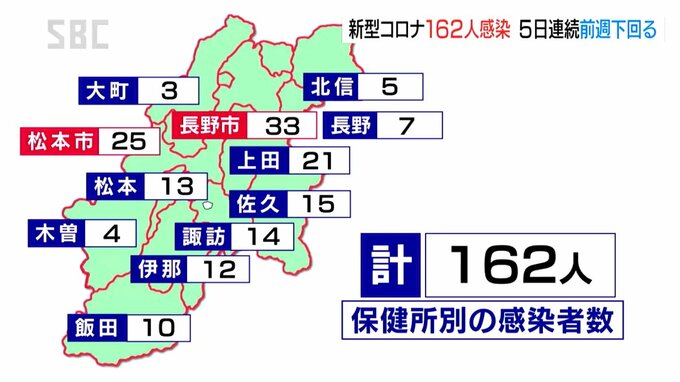 県内では18日、新たに162人が新型コロナウイルスに感染していることが分かりました。保健所別の感染者数は、長野市が33人、松本市が25人、県が管轄する上田が21人、佐久が15人、諏訪が14人などとなっています。感…