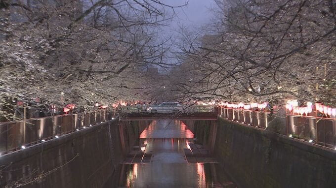東京の桜が開花してから初めての週末。桜の名所「目黒川」では4年ぶりに夜桜のライトアップが18日から始まりました。桜の名所として人気の目黒川沿いで4年ぶりに桜を照らすぼんぼりが点灯しました。見ごろはまだで…