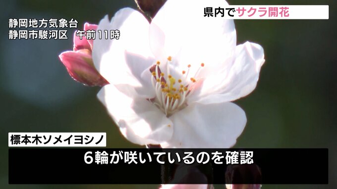 静岡地方気象台はきょう静岡県のサクラの開花を発表しました。静岡市駿河区の静岡地方気象台ではけさ、標本木になっているソメイヨシノに6輪の花が咲いているのを確認しため、県内でのサクラの開花を宣言しました…