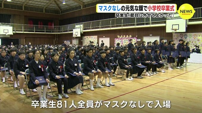 広島市中区の幟町小学校の卒業式には、81人の卒業生全員がマスクを外して元気な顔を見せて入場しました。