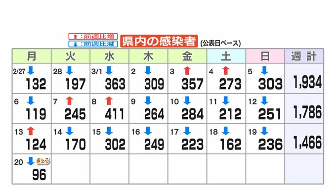 県内の一日の感染者数が100人を下回るのは、2022年7月4日以来8か月ぶりです。