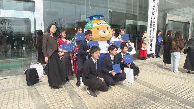 松山大学では20日、4年ぶりにコロナ禍前と同じかたちで卒業式が行われ、1100人あまりが新たな門出を迎えました。また、創立100周年を記念した珍しいお祝いもありました。20日にお披露目された伊予鉄道の市内電…