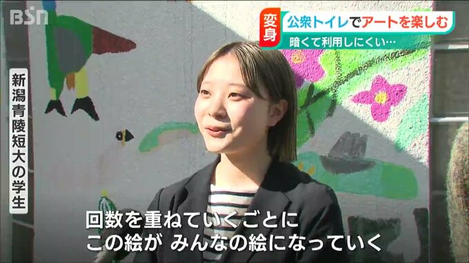 新潟青陵短大の学生も一緒に去年11月から製作をはじめ、完成したのがこのトイレアートです。