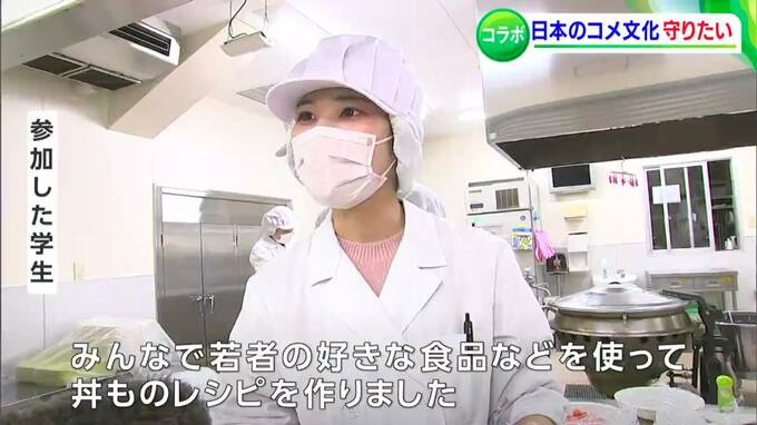 (ノートルダム清心女子大の学生)「米の消費量拡大に向けて、みんなで若者の好きな食品などを使って、丼もののレシピを作りました」