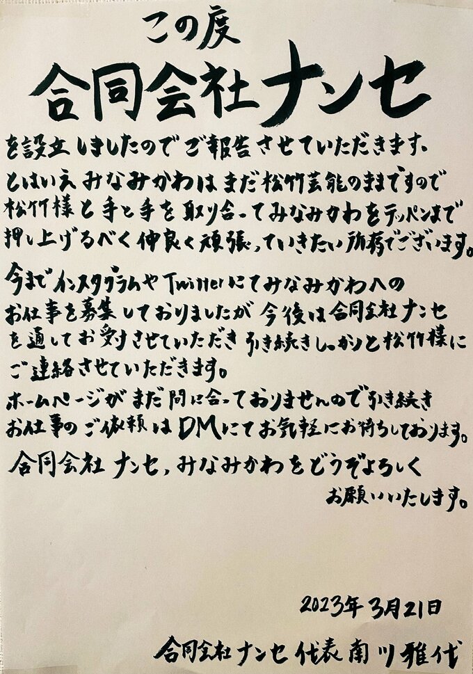 今までインスタグラムやTwitterにてみなみかわへのお仕事を募集しておりましたが今後は合同会社ナンセを通してお受けさせていただき引き続きしっかりと松竹様にご連絡