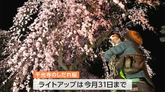 岡山県北・津山市の千光寺で、しだれ桜が見ごろを迎え、ライトアップが始まりました。