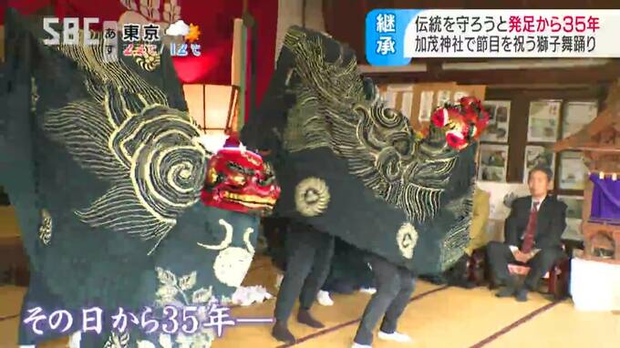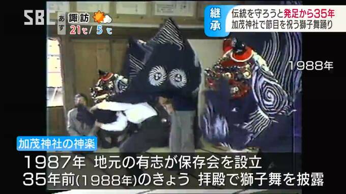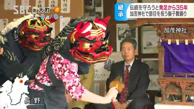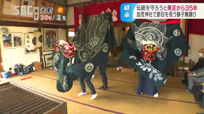 地域の伝統を守ろうと発足した長野市の「加茂(かも)神社神楽ばやし保存会」が35周年を迎え、お祝いの獅子舞が披露されました。