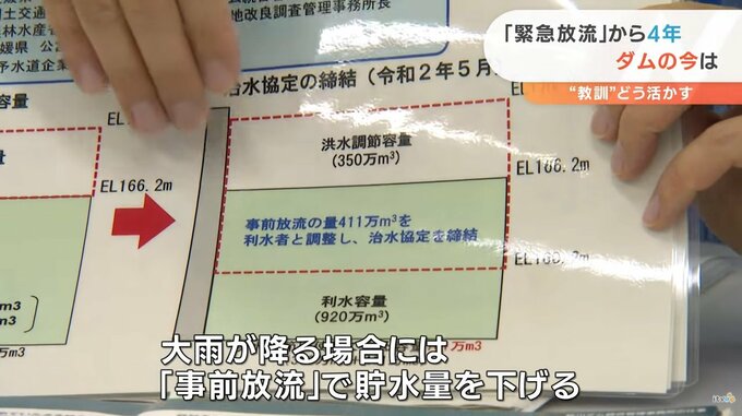 「『利水容量』の920万トンのうち、411万トンを、大雨が降る場合には、『事前放流』で貯水量を下げる」