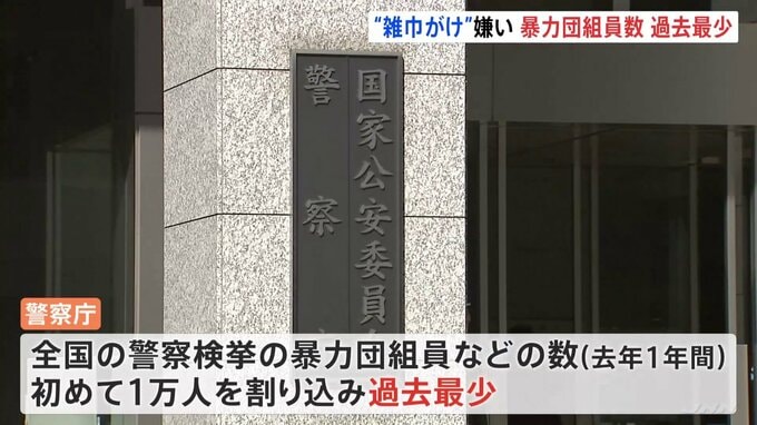 去年1年間に全国の警察が検挙した暴力団組員などの数が、初めて1万人を割り込み、過去最少になったことが警察庁のまとめで分かりました。警察庁によりますと、去年1年間に全国の警察が検挙した暴力団組員などの数は…
