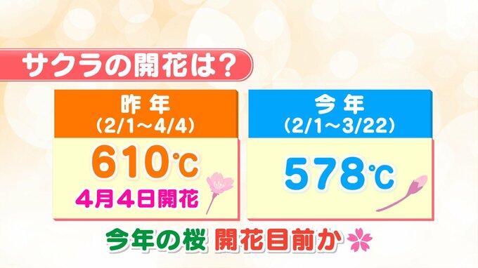 去年は合計が610℃となった4月4日に開花しました。今年は22日までに578℃となっています。
