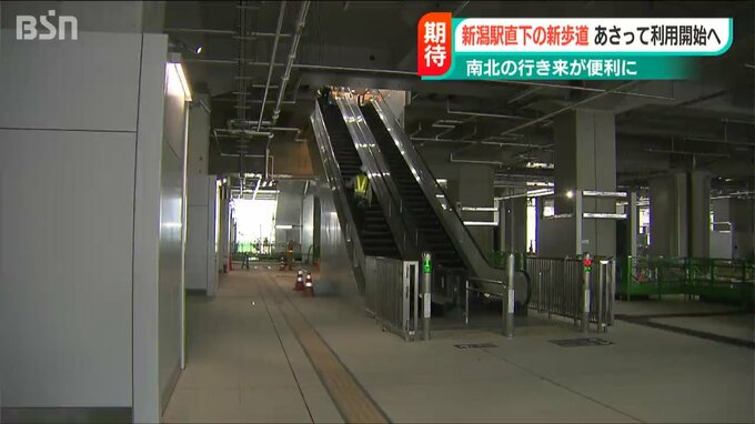 新潟駅の真下を南北に繋ぐ新たな歩道が3月25日から利用できるようになります。23日、一足早く報道陣に公開されました。来年春完成予定の駅直下バスターミナル。【記者リポート】「あさって土曜日に供用が開始され…