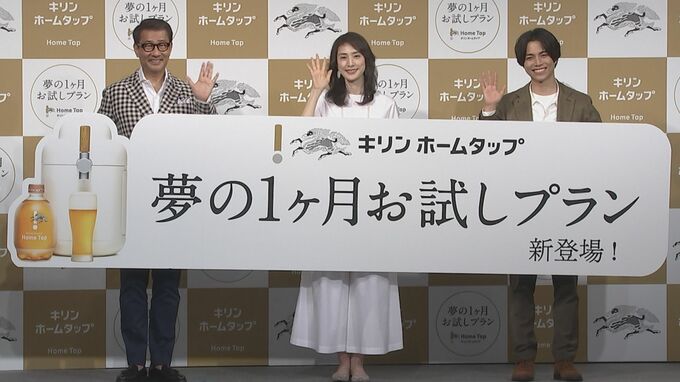 俳優の中井貴一さん、天海祐希さん、ジャニーズWESTの重岡大毅さんが、会員制 生ビールサービス「キリン ホームタップ」サービスアップデート発表会に出席しました。キリンビールが提供する会員制・生ビールサービス「キリン ホームタップ」の新CMに、これまで夫婦役を演じてきた中井さんと天海さんに加え、天海さんのおい役で重岡さんが加わりました。