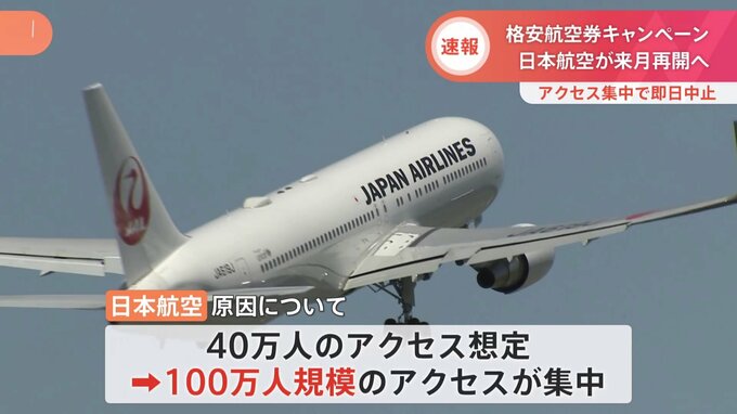 日本航空は、中止していた国内線の格安航空券キャンペーンについて、来月にも再開すると会見で発表しました。「JALスマイルキャンペーン」は日本航空が今月9日に開始し、すべての国内線の片道料金が6600円になると…