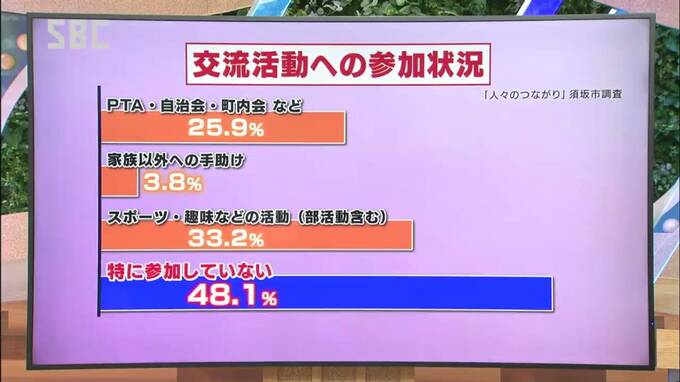 このほか、PTAや町内会、部活動などの交流活動へ「特に参加していない」という人が48.1%と半数近くを占め、年代別では20代と30代で6割から7割に上りました。