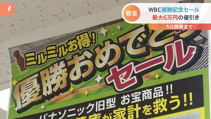 14年ぶりにWBC優勝を果たした「侍ジャパン」の勢いに乗るべく、こちらの家電専門店では…記者「WBCで話題となったペッパーミルパフォーマンス、それにちなんだ優勝おめでとうセールが行われています」「ミルミルお…