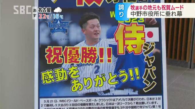 WBCの優勝から一夜明け、牧秀悟(まきしゅうご)選手の地元・中野市の市役所庁舎には、大きく「中野市出身 牧秀悟選手 WBC2023 日本優勝おめでとう」と書かれた横断幕が!