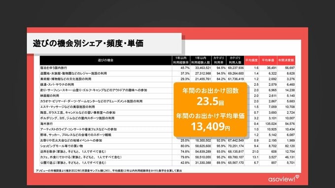 時間的、経済的に余裕がある人たちは、子どもの体験にも投資をしています。『アソビュー』という体験のプラットフォーム会社のデータでは、子どもとの年間のお出かけ回数が平均23.5回で、1回あたりのおでかけ平均単価が1万3409円ということです。体験をする余裕がある家庭においては、月に約2回、かなりの金額を体験に費やしています。