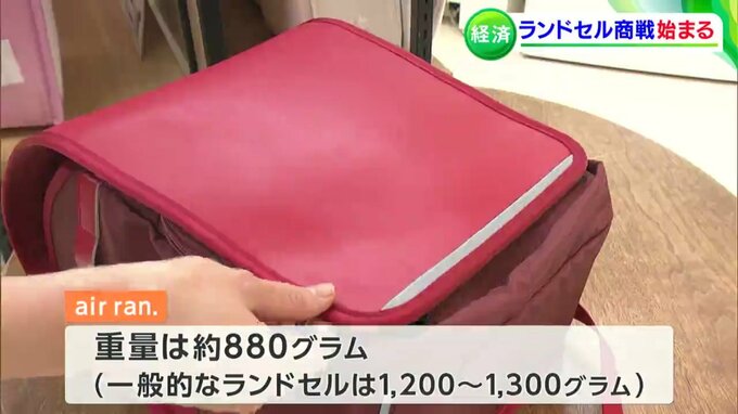 昨年から販売が始まったair ran.(エアラン)です。重さは約880gで、ふた部分以外にはナイロンなど軽い素材が使われていて、重さは一般的なランドセルの3分の2ほどです。