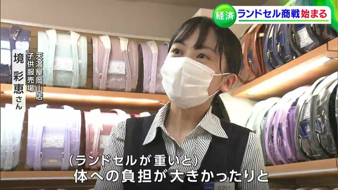 来年春に小学校に入学する子どもを対象にしたランドセルの販売が、岡山市北区の百貨店ではやくも始まりました。近年では「より軽く」「体の負担を減らすことができる」ランドセルに注目が集まっているそうです。