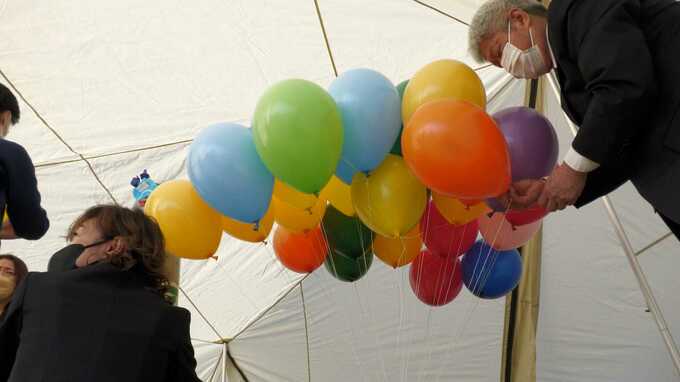 そしていよいよ、閉校式の日(3月19日)を迎えました。この日のために猛練習してきた子供たちが発声練習で緊張をほぐしてしている中、運動場では保護者たちがバルーンの準備をしていました。