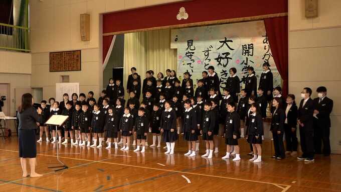 さまざまな思い出と惜別の思いを胸に、開小の57人が「大好きな場所」を歌います。