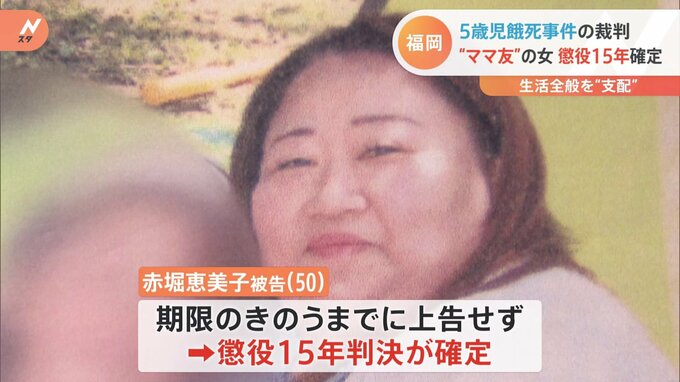 3年前、福岡県篠栗町で母親と共謀し、5歳の男の子を餓死させたママ友の女の裁判。1審の懲役15年判決を支持した福岡高裁の判決が確定しました。1審と2審の判決によりますと、無職の赤堀恵美子被告(50)は、生活全…