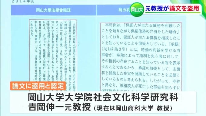 岡山大学大学院の法学系の研究科の元教授が発表した論文に、盗用があったことが明らかになりました。盗用が認定されたのは、社会文化科学研究科の元教授で現在は、岡山商科大学法学部の吉岡伸一教授が、2014年と2018年に発表した論文です。