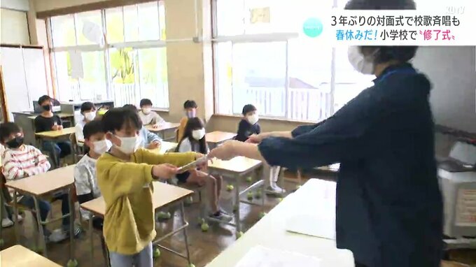 高知県内のほとんどの公立小学校で修了式が行われました。高知市の小学校では3年ぶりに、みんなが体育館に集まった、対面での式となりました。25日、県内のほとんどの公立小学校で行われた修了式。高知市の一宮小…