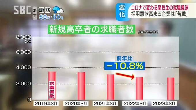 1月末時点で就職を希望する高校生の数は、少子化の影響もあるものの、2019年から減少傾向で、特にコロナ禍以降は、大幅に減っている年もあります。