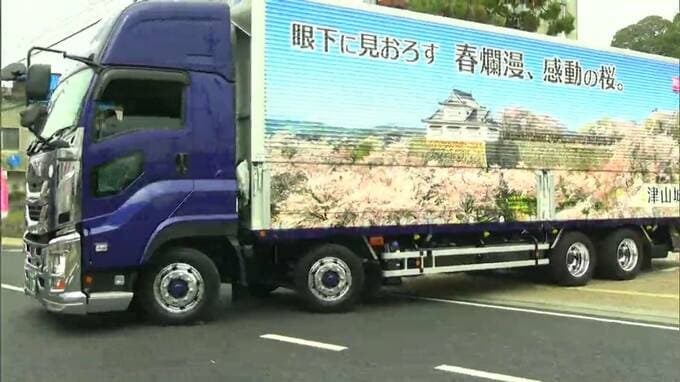 津山市の観光をPRするラッピングトラックが完成し、きょう(25日)記念の出発式が行われました。津山まなびの鉄道館や鶴山公園の桜。津山市の観光スポットがデザインされた運送トラックです。完成を記念した出発式…
