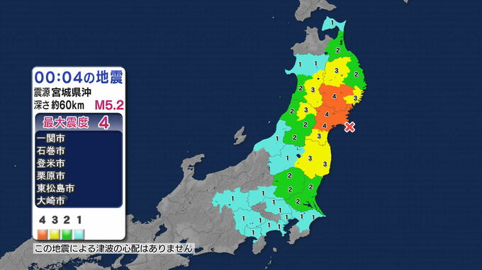 3月27日午前0時04分ごろ、宮城県沖を震源とする最大震度4の地震がありました。震源の深さは約60㎞、地震の規模を示すマグニチュード(M)5.2。この地震による津波の心配はありません。