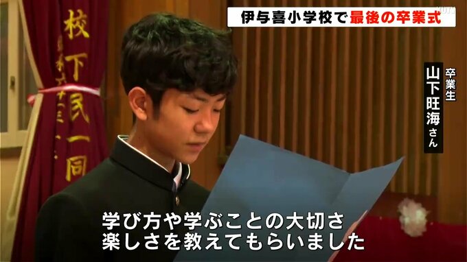 来年度から休校になる高知県黒潮町の小学校で26日、卒業式が行われ、1人の児童が最後の卒業生として巣立ちました。黒潮町の伊与喜小学校で行われた卒業式。全校児童は6年生の男子1人だけ…。校区の6つの集落には新…