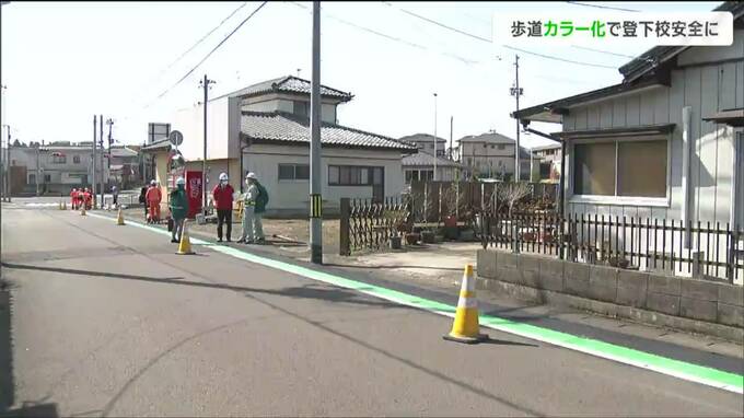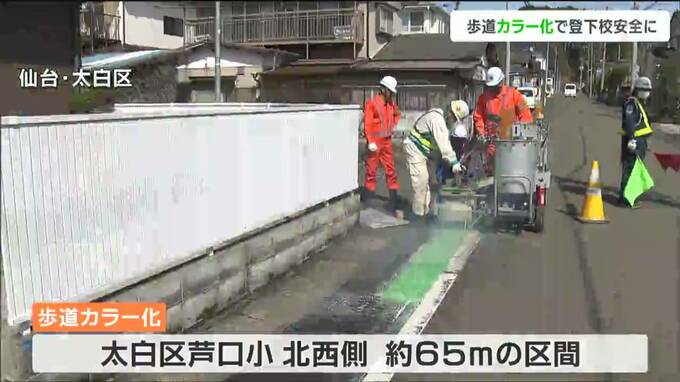子どもがより安全に登下校できるように車道と区別するため、歩道を緑に塗る作業が仙台市で行われました。