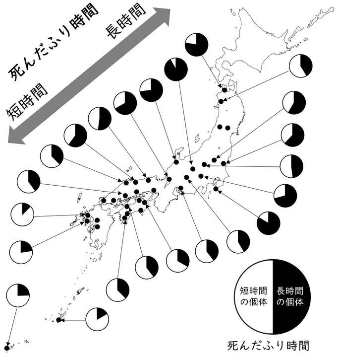 地域によって、死んだふりをした「個体の割合」「持続時間」が異なり、さらに「緯度が高い個体群」の方が、「緯度の低い」 方よりも死んだふりをする割合が高く、持続時間が長いことが明らかになったということです。(【写真を見る】に全国38カ所の調査ポイント別の「死んだふり時間」を掲載しています)