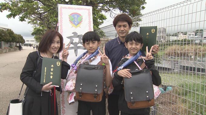 卒業式を終えて、校舎から出てきた2人。その大きくなった背中にランドセルの姿。自慢のランドセルとともに学び舎の前で写真撮影を行う中、その姿を写真に収める父・千善さんは感慨深げな表情を浮かべていました。