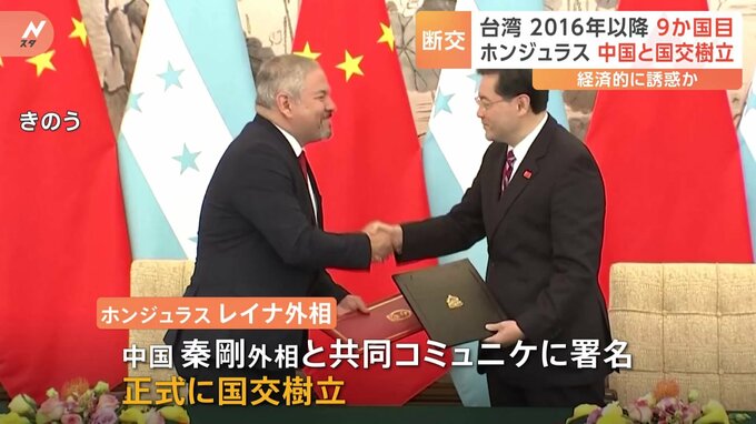 中米のホンジュラスが台湾と断交し、中国との国交を樹立しました。蔡英文総統の就任以降、台湾との断交は9か国目で、来年の総統選を前に外交面で難しいかじ取りを迫られています。おととい北京入りした、ホンジュ…